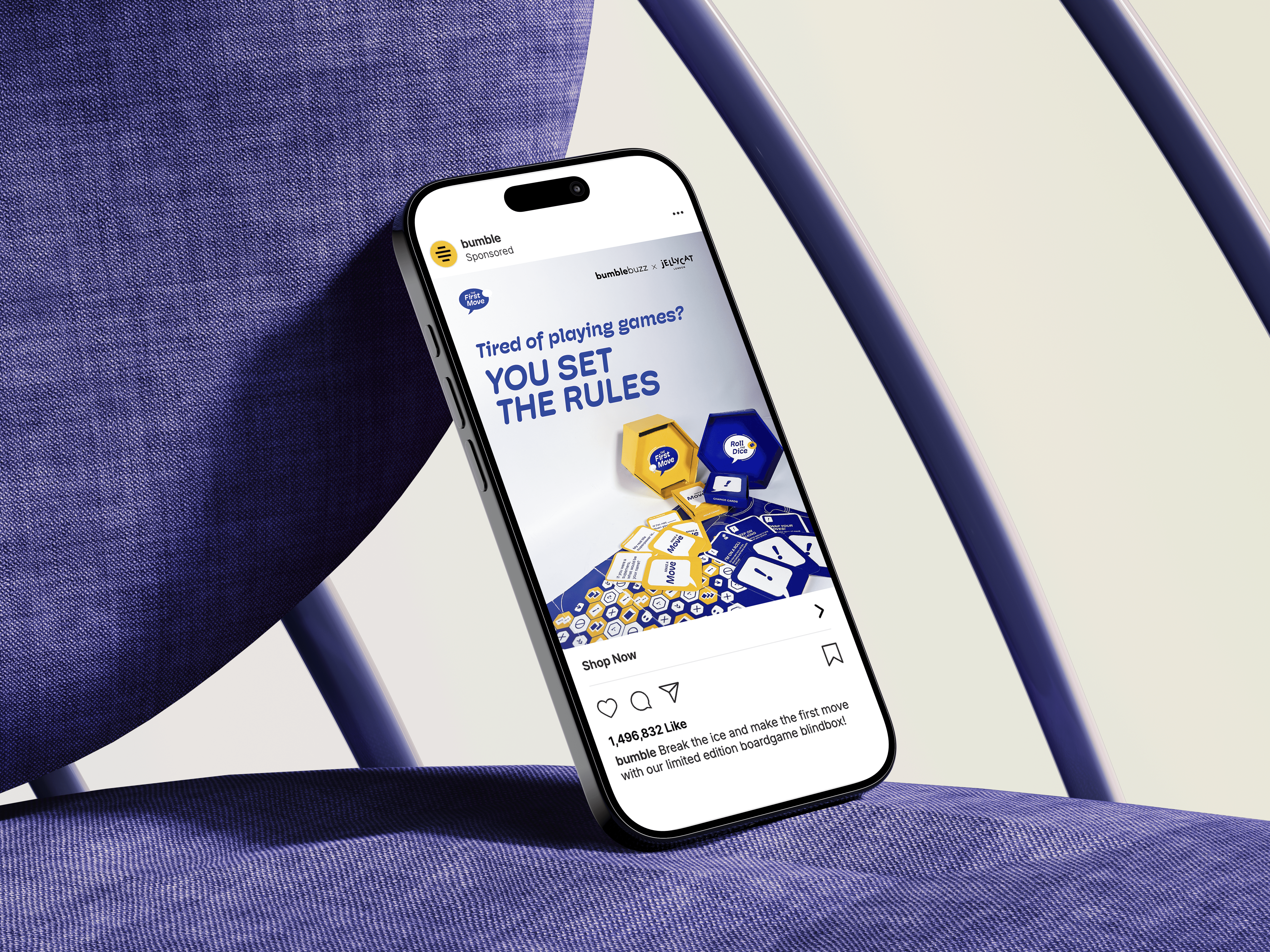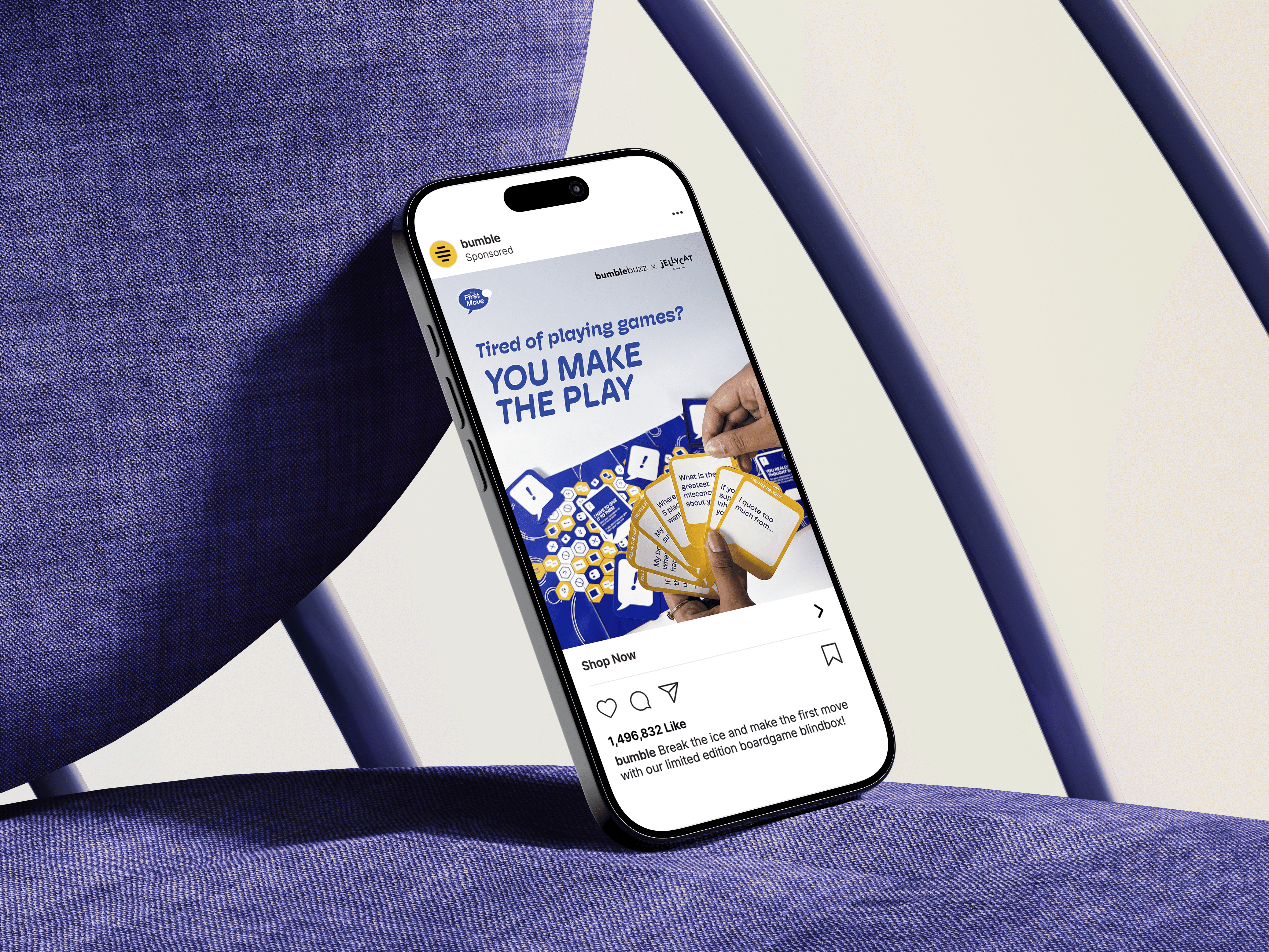 Bumble's Question Game is elevated into a board game, making The First Move. Jellycat's bag charms are included as player pieces and memorabilia for matches. The unboxing experience weaves delight into the first meetup.