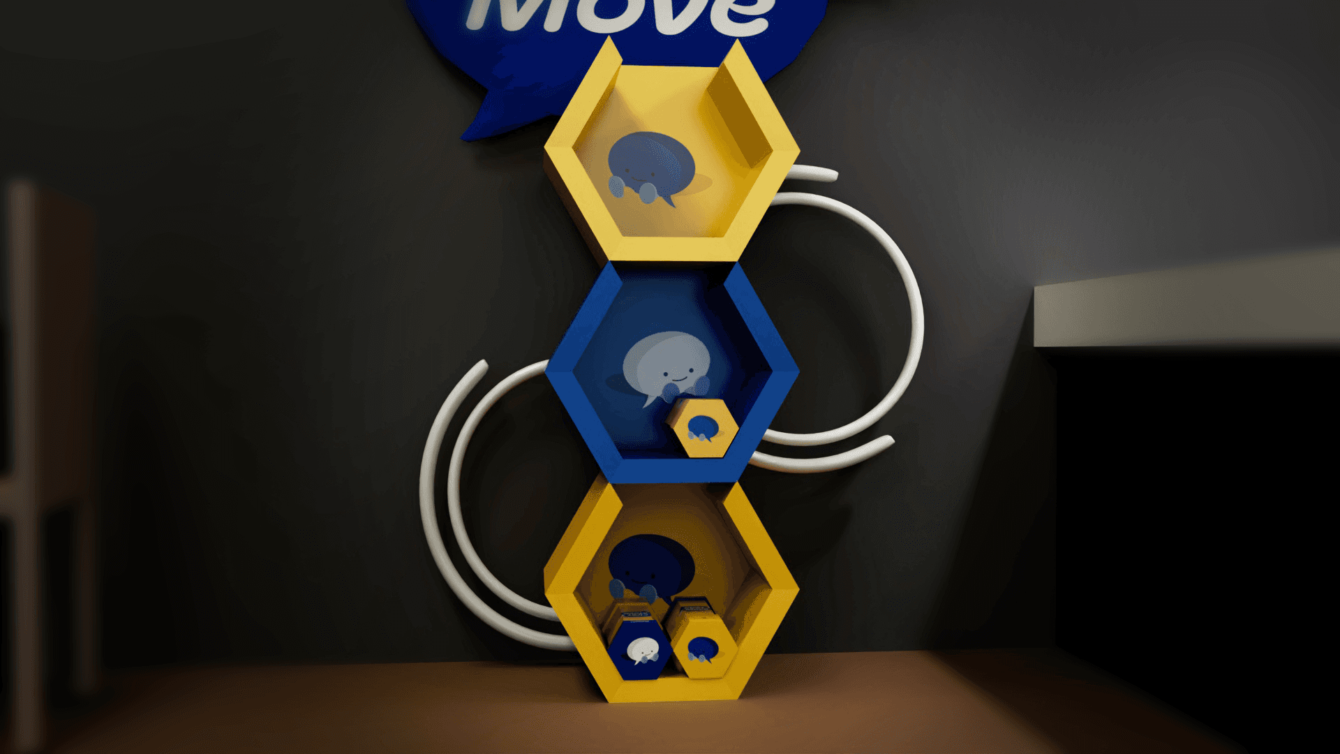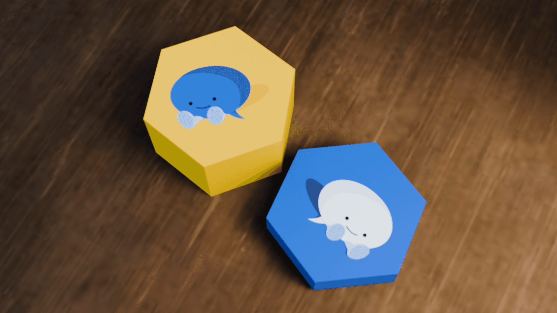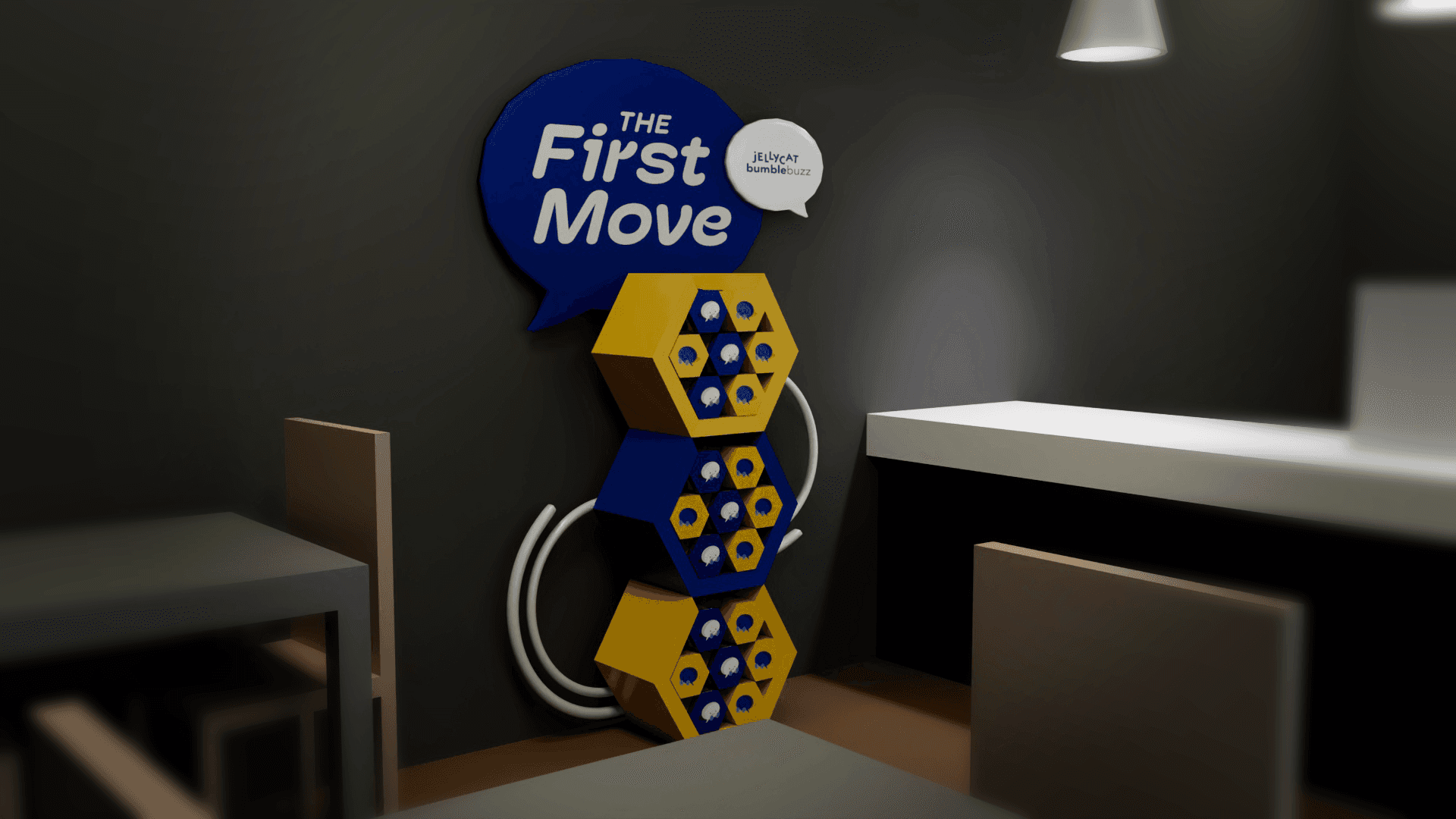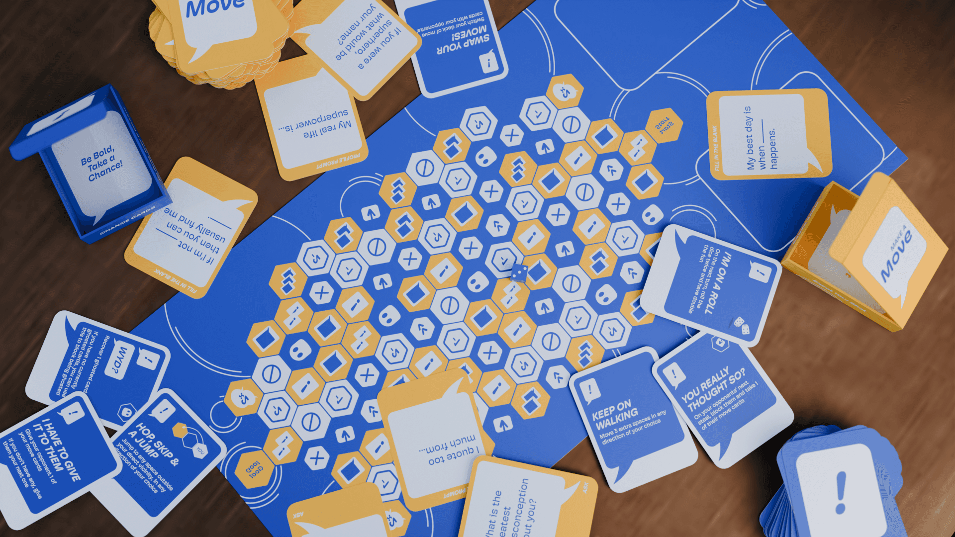 The main box is a hexagon to pay homage to Bumble's logo. The design is made to be portable and playable in common first-meet spaces.